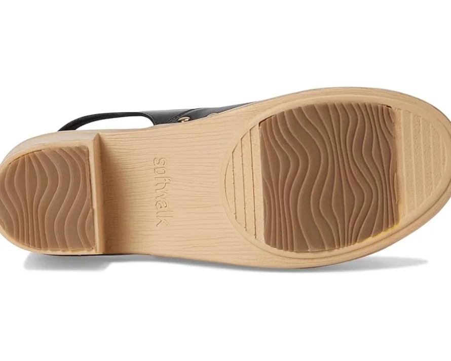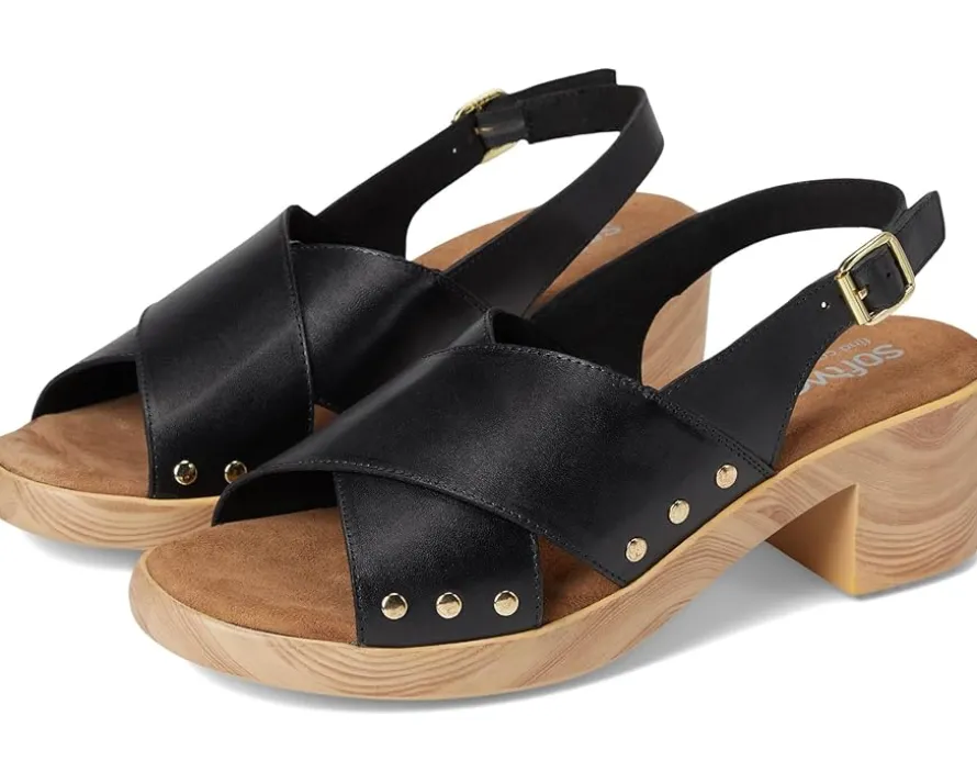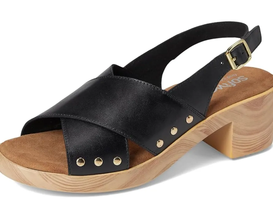 - Embrace the ease wearing the SoftWalk® Florence. Crafted from microfiber upper, leather lining, and footbed, this pair of sandals features open round toe, clog sole with a cross strap sling design that is adorned with chic stud details. The sole has the look of a wooden clog but is actually a lightweight polyurethane sole with rubber insert on the outsole for sure footing. The cushioned footbed is lined in soft suede leather and has arch support.