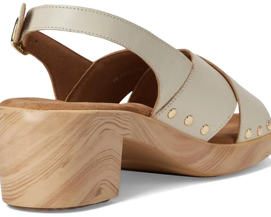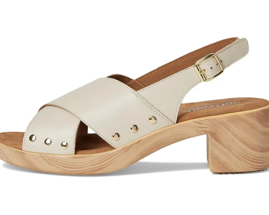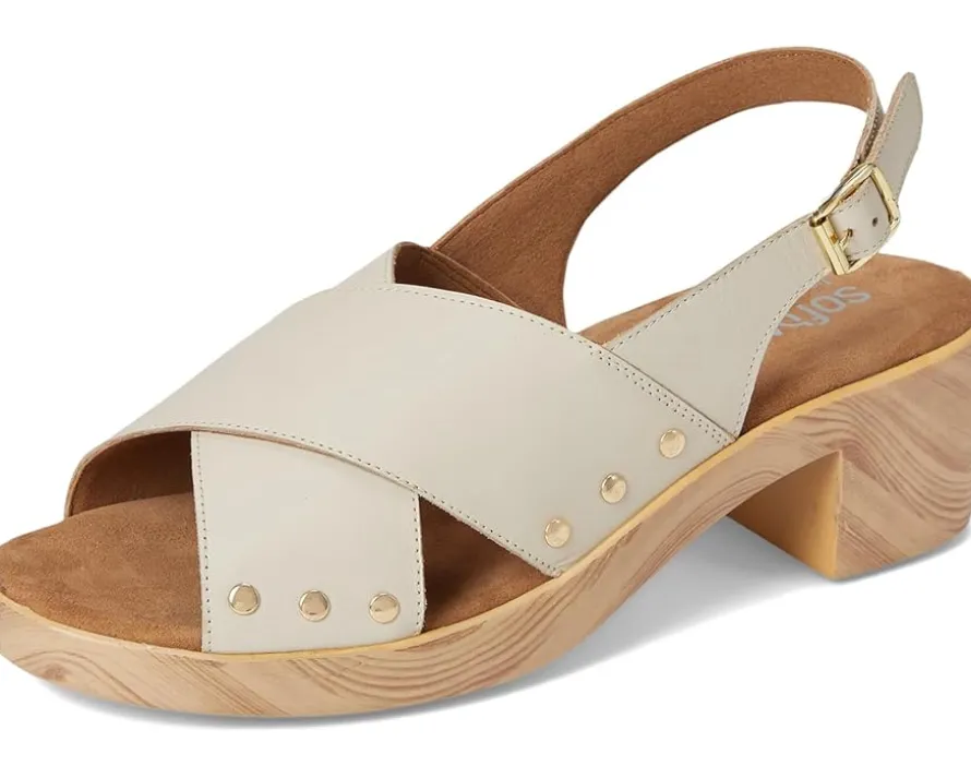 - Embrace the ease wearing the SoftWalk® Florence. Crafted from microfiber upper, leather lining, and footbed, this pair of sandals features open round toe, clog sole with a cross strap sling design that is adorned with chic stud details. The sole has the look of a wooden clog but is actually a lightweight polyurethane sole with rubber insert on the outsole for sure footing. The cushioned footbed is lined in soft suede leather and has arch support.