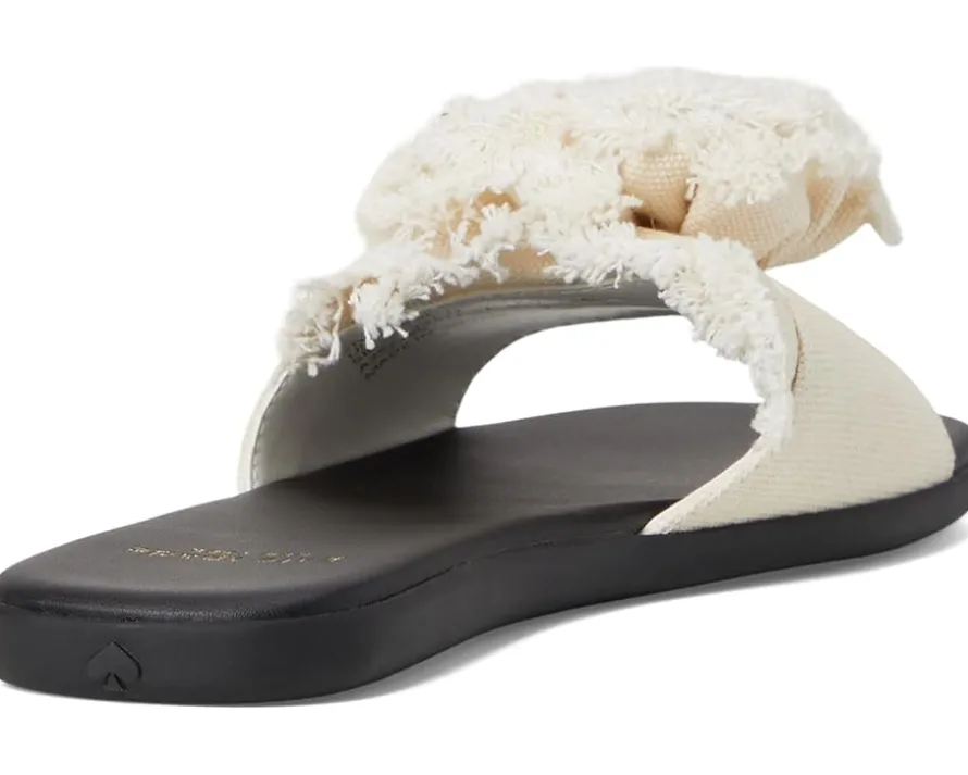 - Let your look blossom in effortless style wearing the Flourish Canvas Flat Sandal from Kate Spade New York®. Designed with a bold rosette accent featuring frayed edges, these slides bring a playful, feminine touch to your warm-weather wardrobe. The open square toe adds a modern edge, while the easy slip-on design ensures all-day comfort.