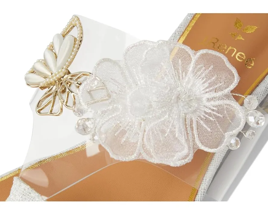- Imagination, underfoot styling J. Renee® Flowerfly. Designed to turn heads, this stunning slip-on sandal boasts a sleek PU upper and transparent vinyl square toe, adding a modern, ethereal touch to your look. The novelty heel brings playful elegance, perfect for making a statement at any event. Comfort meets couture with a plush memory foam + latex insole, offering all-day support, while the synthetic rubber outsole ensures a steady stride.