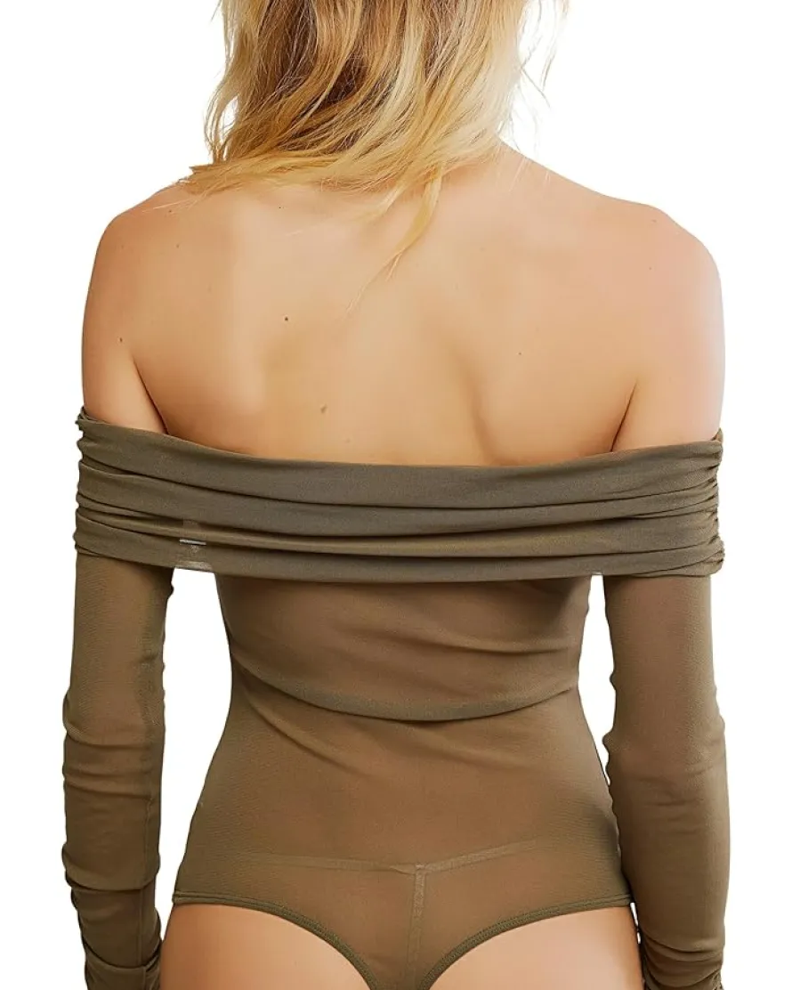 - The Free People™ Forget Me Not Bodysuit is where timeless elegance meets modern edge. Designed in a lightweight mesh fabrication with an off-the-shoulder neckline and ruched details, this form-fitting bodysuit instantly amps up your look. It features fitted long sleeves, ruched cuff detail, a thong bottom, and button gusset.