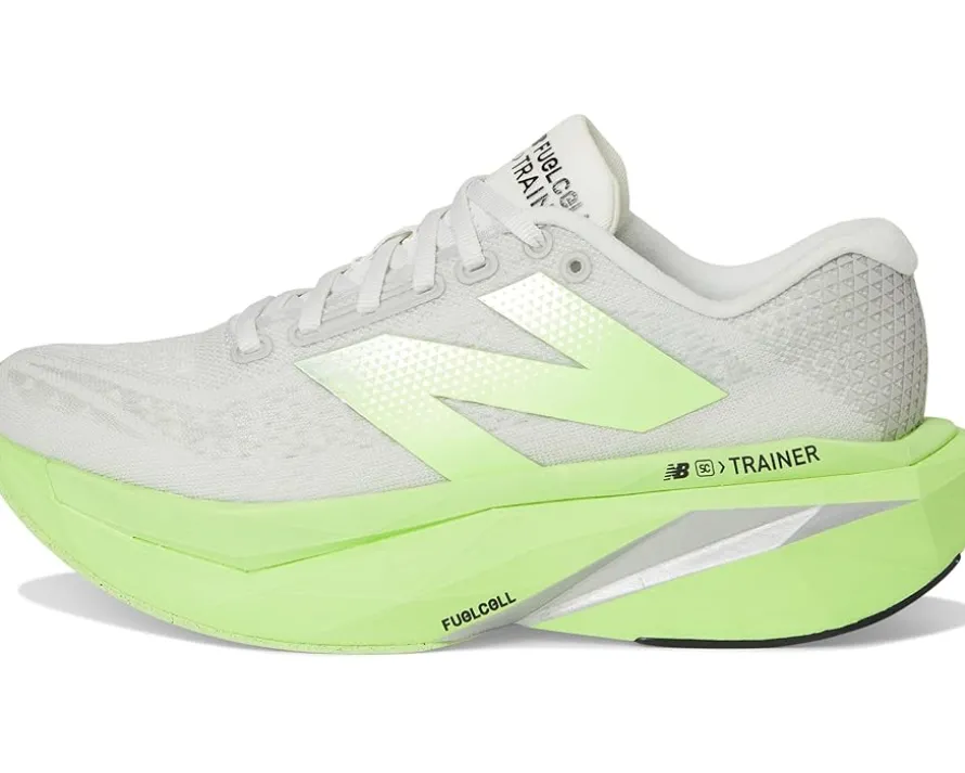 - The New Balance® FuelCell SuperComp Trainer v3 is a high-performance running shoe built for half- and full-marathon training, combining plush cushioning with energy-efficient design. It features a FuelCell midsole foam with approximately 3% bio-based content, offering a propulsive feel. The Energy Arc system integrates a sport-specific carbon fiber plate with strategic midsole voids to maximize energy return, while the angular midsole design helps reduce overall weight. A durable rubber outsole ensures superior traction across varied surfaces, making it ideal for long-distance runners seeking comfort and speed.