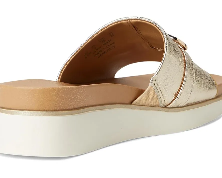 - Effortless chic, redefined: LifeStride® Genevieve effortlessly blends casual comfort with refined style. These chic slide sandals are designed with faux leather or woven fabric, a soft square open toe, and a slip-on fit that makes getting ready a breeze. The metallic ornament detail adds just the right touch of glam to elevate any outfit, from laid-back weekends to evening strolls. Crafted with Soft System® comfort technology, the foam insole and synthetic rubber outsole provide unbeatable cushion, support, and flexibility. The traction sole ensures stability with every step, while the partially recycled linings offer eco-friendly appeal. These slides are the perfect blend of fashion and function, ready to complete your closet essentials.