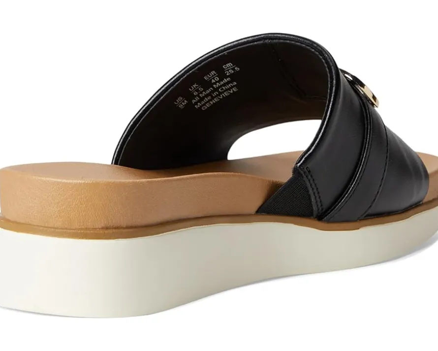- Effortless chic, redefined: LifeStride® Genevieve effortlessly blends casual comfort with refined style. These chic slide sandals are designed with faux leather or woven fabric, a soft square open toe, and a slip-on fit that makes getting ready a breeze. The metallic ornament detail adds just the right touch of glam to elevate any outfit, from laid-back weekends to evening strolls. Crafted with Soft System® comfort technology, the foam insole and synthetic rubber outsole provide unbeatable cushion, support, and flexibility. The traction sole ensures stability with every step, while the partially recycled linings offer eco-friendly appeal. These slides are the perfect blend of fashion and function, ready to complete your closet essentials.