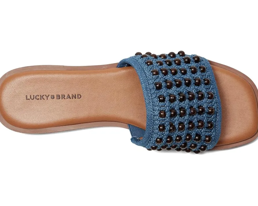 - The Lucky Brand® Gidya Beaded Flat Sandals are designed to make a statement with their beaded woven detailing. With an open square toe silhouette, the slip-on footwear has breathable mesh lining and padded insole construction for all-day comfort.