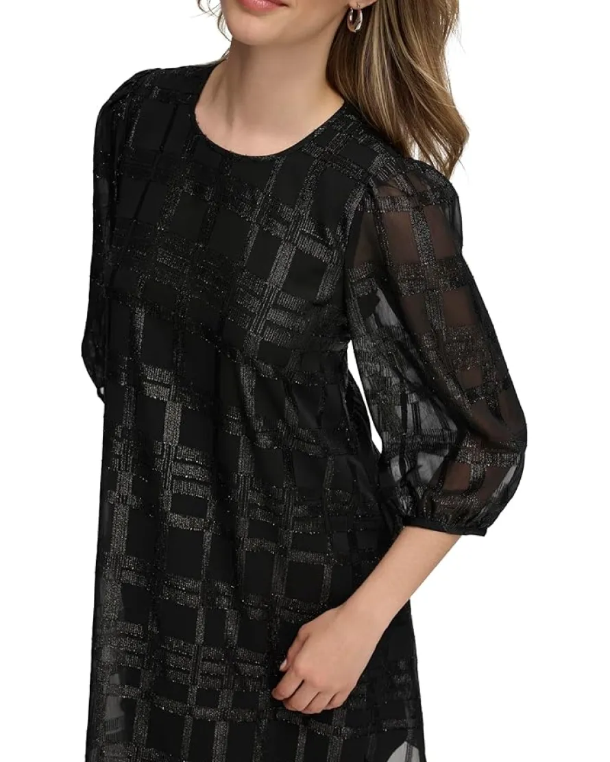 - Elbow-length chiffon balloon sleeves and a round neckline.