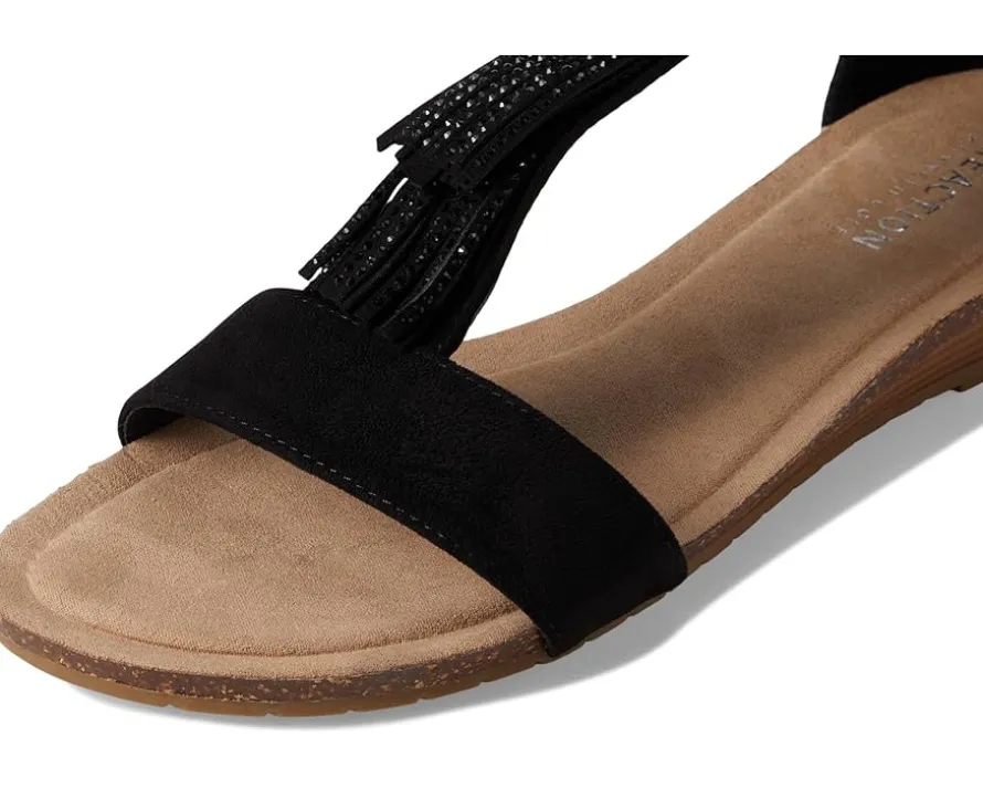 - The eye-catching fringe motif on the Kenneth Cole Reaction® Glytoni adds a touch of boho-chic flair to your look, ensuring you stand out in any crowd. These wedge sandals come with a soft, cushioned footbed that provides all-day comfort. The backstrap features a zippered closure and buckle adjustable strap for a secure fit.