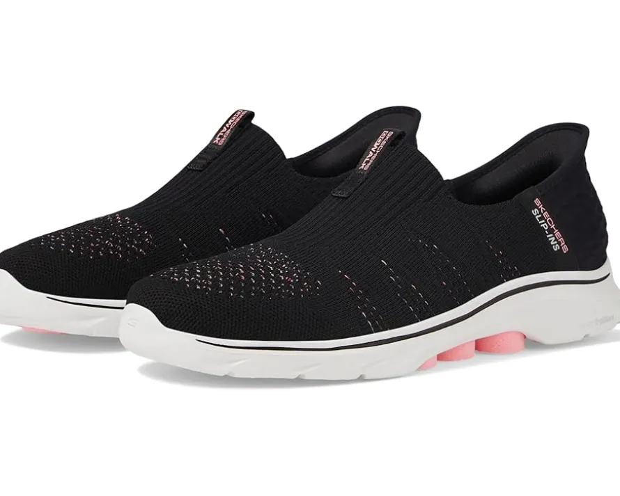 - Run in comfort wearing the SKECHERS® Performance Go Walk 7 City Lights Hands Free Slip-Ins. Crafted from synthetic upper, this pair of slip-on shoes features round toe design. Made with responsive ultra go cushioning with hyper pillar comfort technology.
