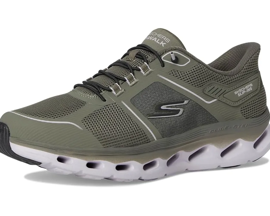 - Simply step into flexible comfort wearing the SKECHERS® Performance Go Walk Glide Step 2.0 Elektra Hands Free Slip-Ins. Designed with Exclusive Heel Pillow™ that holds your foot securely in place, this bungee lace slip-on style features grid mesh upper with hotmelt overlays, Skechers Air-Cooled Goga Mat™ breathable insole with high-rebound cushioning, and lightweight ULTRA GO® cushioned midsole. A well-cushioned walking shoe with fixed, tied-off stretch laces.