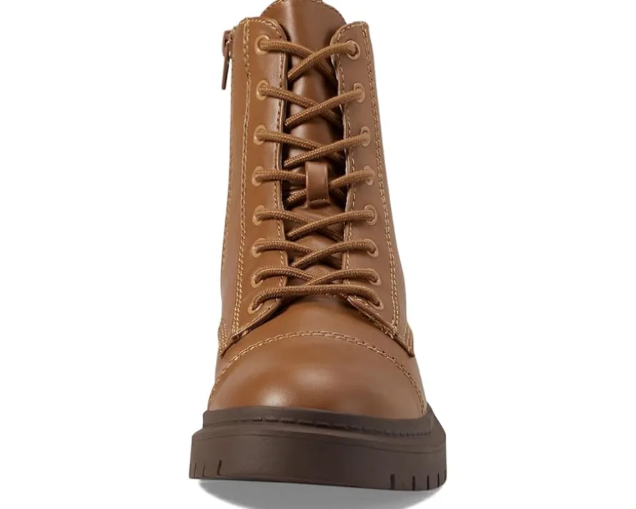 - One-tone combat boot with zip-up construction, faux laces, and a back pull-tab.