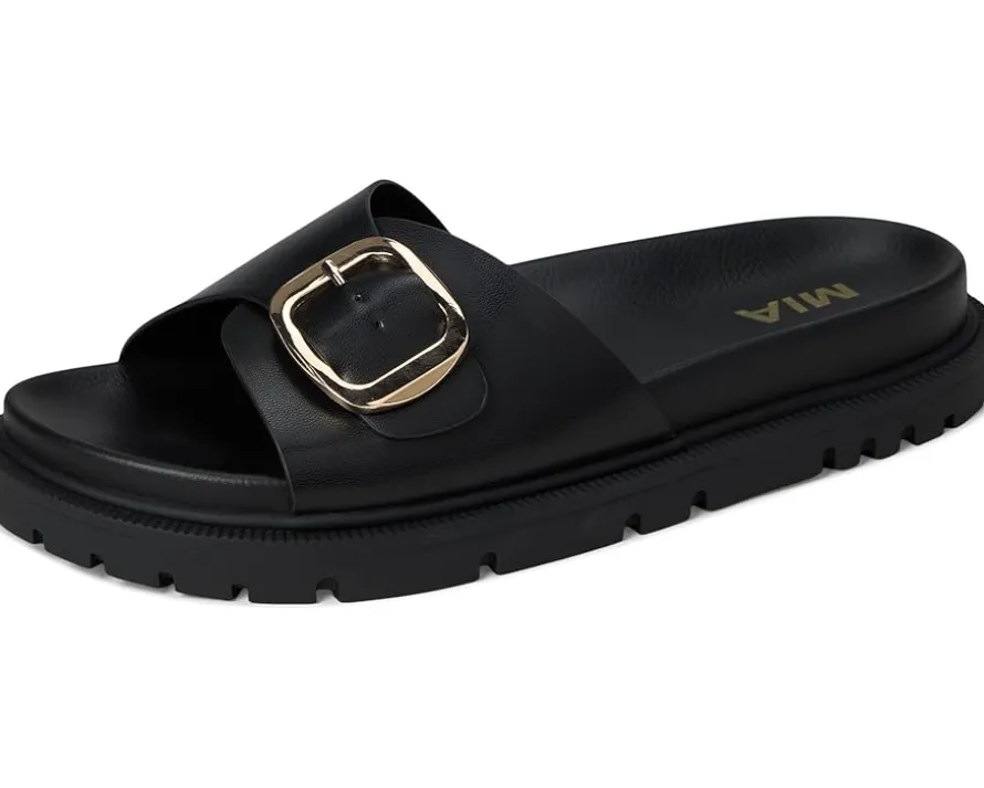 - Your slide collection just got better: MIA™ GYA-T. Crafted from vegan leather upper and featuring a trendy buckle design, this sandal is perfect for all-day wear. Finished on our signature contoured footbed and chunky sole, GYA is your warm-weather go-to.
