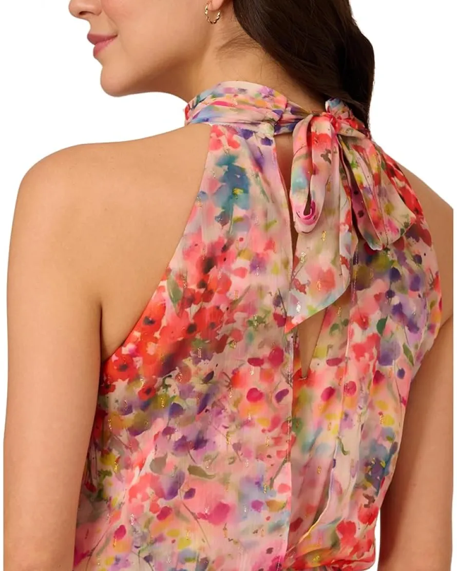 - No matter your destination, the Adrianna Papell® Halter Tie Blouson Midi Dress is sure to leave an impression. It features a blouson bodice, halter neckline, and soft skirt. Designed with painterly floral chiffon fabric, this dress has a shirred mock neck that leads to a self-tie back with a keyhole cutout accent. An elastic waist makes this pull-on dress a comfortable style.