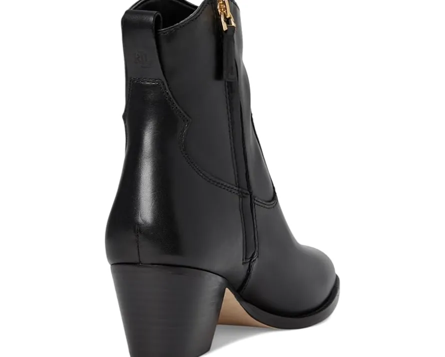 - The essence of enduring style: The Lauren Ralph Lauren® Harpher Burnished Leather boots are a modern classic for the effortlessly chic. Crafted with a luxe leather upper, lining, insole, and outsole, this calf-high stunner features a pointed toe and stacked leather heel that elongate your silhouette with runway-worthy refinement. The side zippered closure ensures a smooth, secure fit, while a leather pull tab with a subtle “LRL” debossed logo adds a refined designer touch. With a softly padded insole for all-day comfort, these boots blend timeless polish with practical ease.