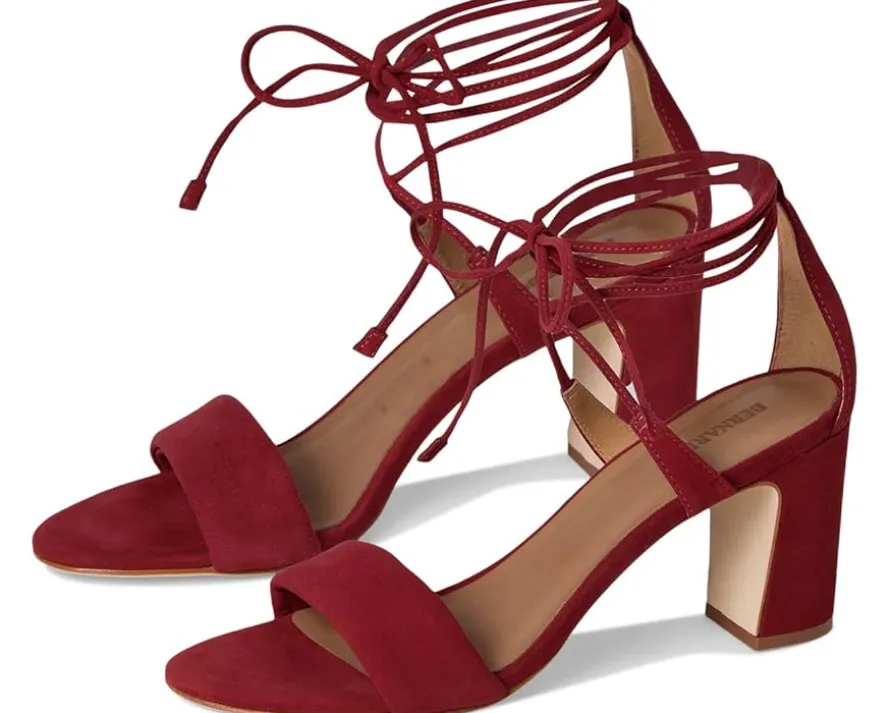 - Bound by luxury. This Bernardo® Ieda block heeled sandal, crafted in luxurious kid suede, features a sleek toe strap and delicate wraparound ankle ties for a secure and flattering fit. Perfect for parties, this pair of sandals features open round toe, strappy design with tie closure, and brand detailing on the footbed.