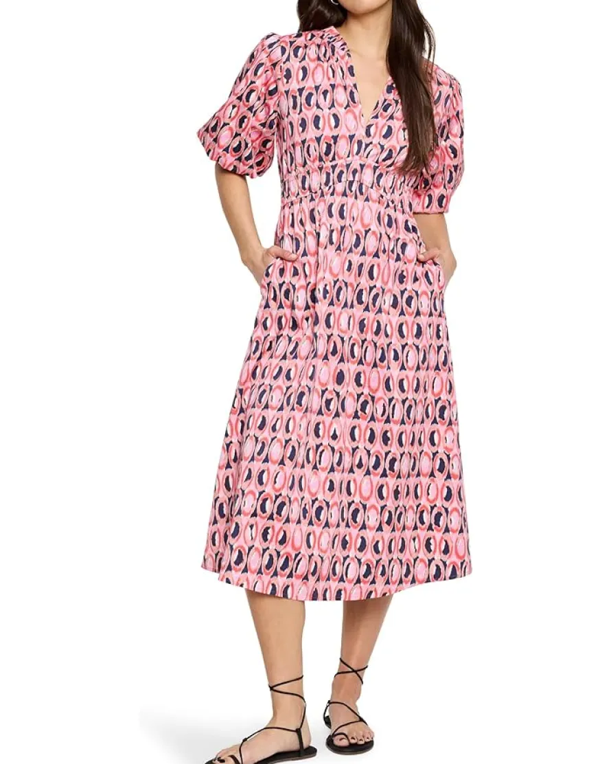 - Add a pop of color to your basic look wearing NIC+ZOE™ Ikat Rings Mary Dress. Crafted with cotton and just a hint of stretch, Ikat Rings add breathable comfort and a flattering fit to your dress rotation. The geometric yet softly shaped pattern adds a playful touch, while the dark indigo tones bring a sophisticated edge. A delicate ruffle around the split neckline enhances its feminine appeal, and the elastic waist, designed to point upward, creates a beautifully detailed silhouette. Subtle balloon sleeves with elasticated sleeve openings complete the look, making this pull-on, fit-and-flare dress fun and flattering without being overpowering. It also features side seam pockets, elastic detail at the waist, allover printed design, and a below-the-knee silhouette.