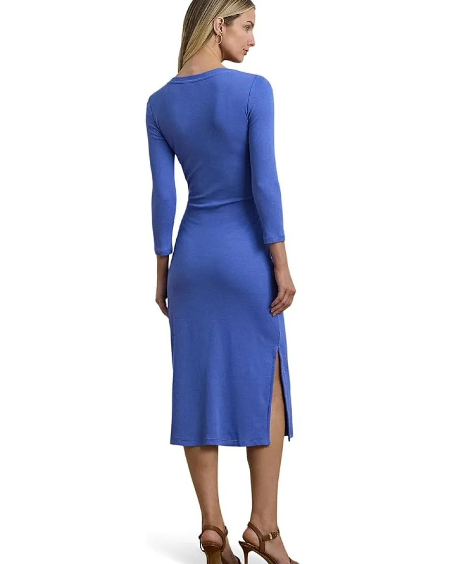 - Rib-knit with a soft stretch-cotton blend, the Lauren Ralph Lauren® Imalah-Long Sleeve-Day Dress is cut for a slim-fitting silhouette and a calf-grazing midi length. A tie-front design at the waist adds contemporary flare, while a skirt slit ensures ease of movement. This fitted dress is designed with long sleeves, a crew neckline, and a straight hem.