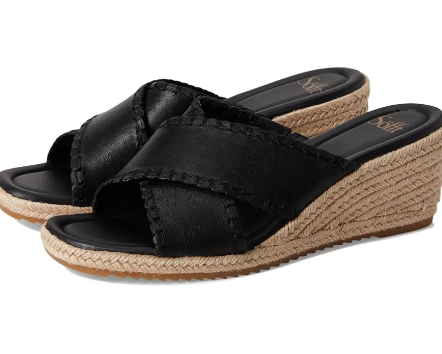 - The Sofft® Indie is here with its X-band slide design and intricate whip-stitching detail. The espadrille style adds a touch of rustic charm, while the wrapped rope wedge mid-heel provides a flattering lift.