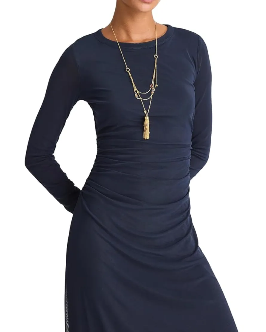 - The Madewell® Irina Dress Mesh is fully lined throughout the body with sheer long sleeves, offering a flattering look and comfy feel. Crafted in stretchy mesh, this midi dress is designed with a jewel neckline, a ruched waist, and a straight hem. Make your fashion statement wearing this mesh dress.