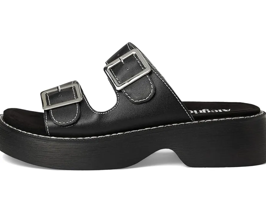 - Support meets style, seamlessly wearing the Alegria® Iza slip-on sandal. Crafted with a premium leather upper and lining, this sleek design wraps your feet in breathable luxury. The double-strap silhouette, featuring adjustable buckle closures, ensures a customized fit while adding a modern touch to your look. A soft faux leather insole cradles your feet, offering lasting comfort, while the lightweight PU outsole delivers superior flexibility and durability.