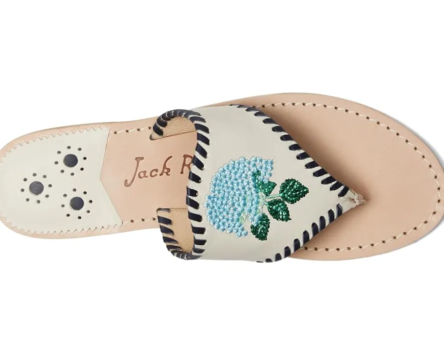 - Capture poise and elegance wearing the Jack Rogers® Jacks Hydrangea. Crafted from leather upper, lining, and insole, this pair of sandals features open round toe, thick upper strap with elegant hydrangea embroidery and contrasting whip stitch details. Slip into elevated elegance with the soft leather footbed and cushioned block heel of these Ivory white summer fashion sandals.