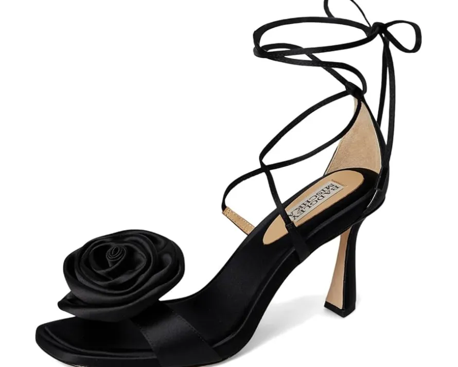 - Strappy and stylish, the Badgley Mischka® Janelle is crafted from silk upper, breathable leather lining, and foam insole. This pair of strappy sandals features open round toe, big flower detailing on the vamp, tie closure, and brand detailing on the footbed.