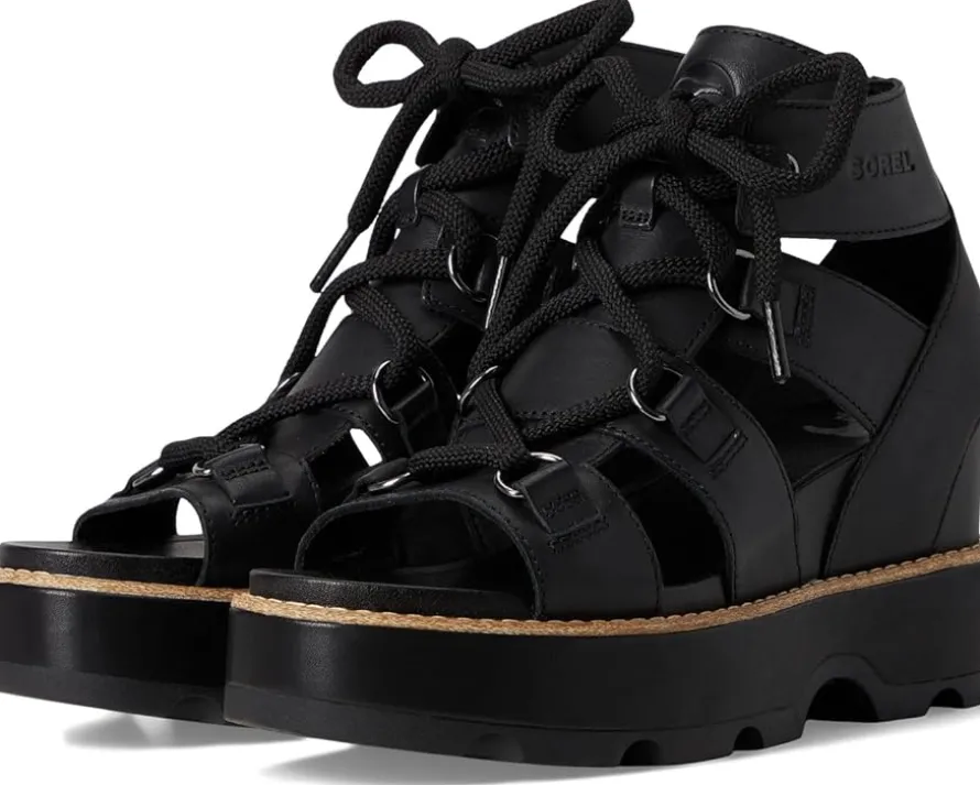 - The SOREL® Joanie™ IV Lace Wedge packs a lot of personality into one sandal. It starts with the premium materials, like suede, leather and rich hardware and ends with a striking, all-day wear sole. Available in full grain leather (CW 010, 246) or suede and leather (CW 697). The sandals feature synthetic lining, EVA foam with synthetic topcover, natural welt construction with stitch detail, and textured synthetic wrapped midsole.