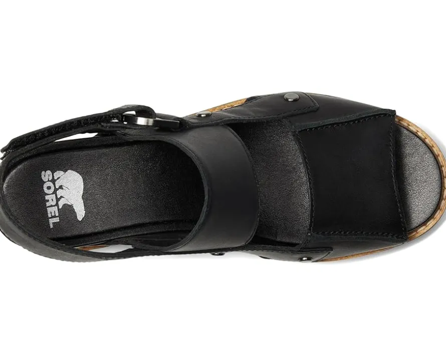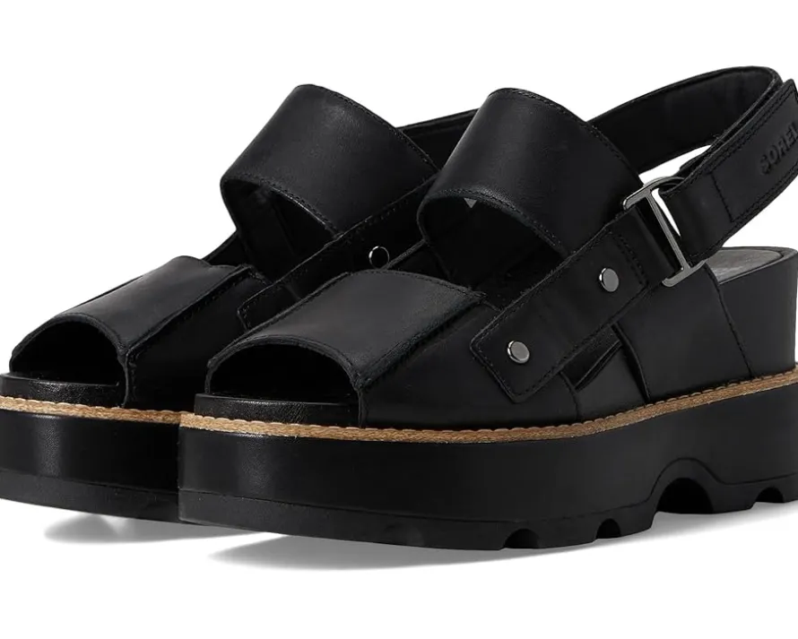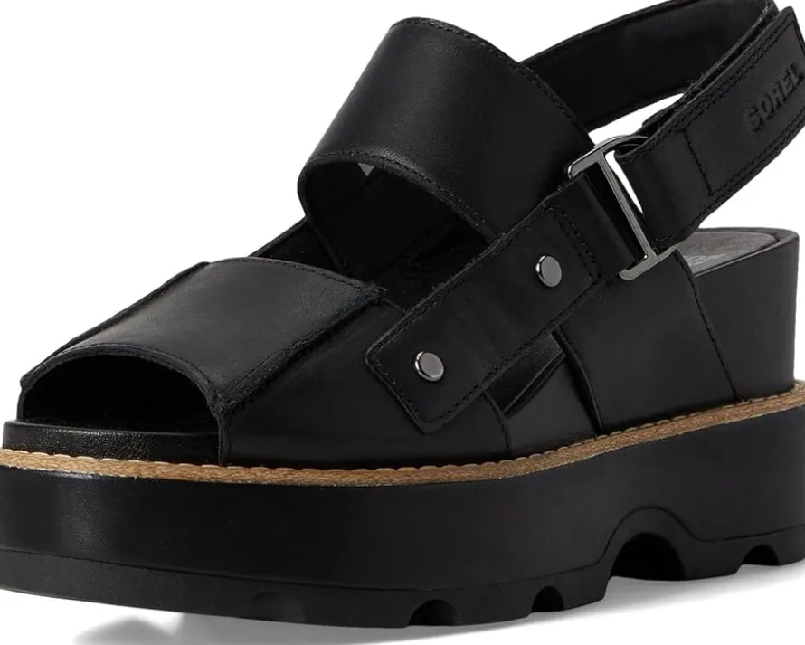 - The fit is it with the SOREL® Joanie™ IV Sandals Wedge. With adjustable leather straps, you can create your perfect fit so you can go from day to night, with no problem. Available in full-grain leather (CW 010, 246) or full-grain leather and suede (CW 084). Crafted from full-grain leather upper, synthetic lining, plush EVA foam footbed with synthetic topcover, and molded rubber outsole. The sandals feature adjustable ankle strap, textured synthetic wrapped midsole, and natural welt construction with stitch detail.