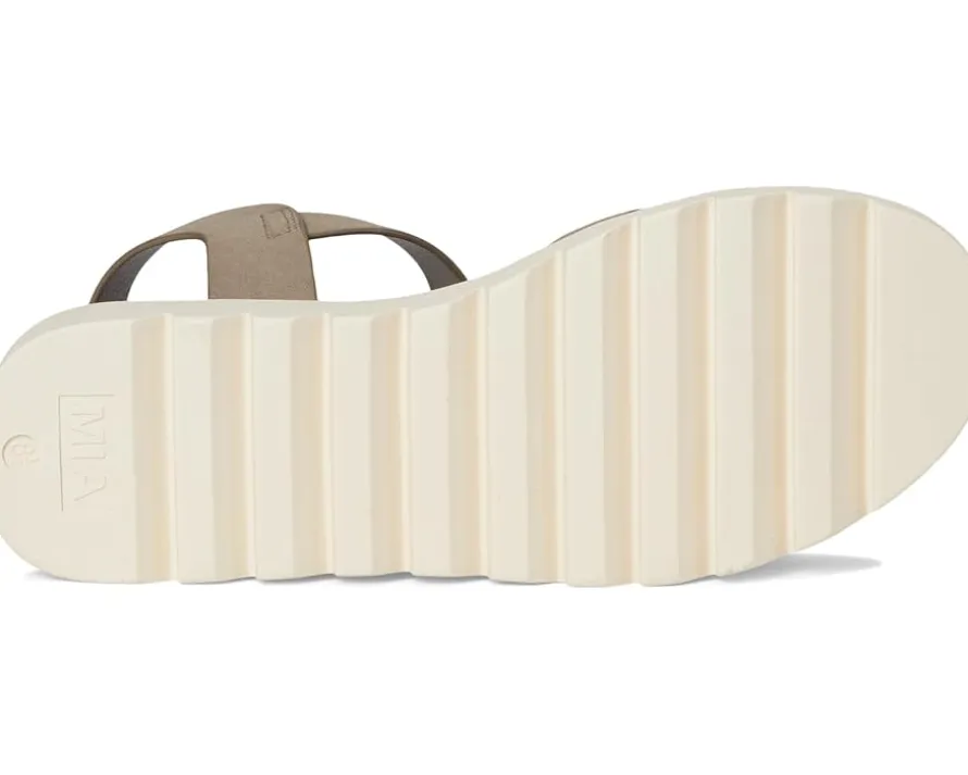 - Designed to fit seamlessly to your everyday lifestyle, the MIA™ Jovie Sandals feature a strappy faux leather upper with a silvertone buckled closure at the ankle, a soft faux leather lining, and a comfortable cushioned insole.