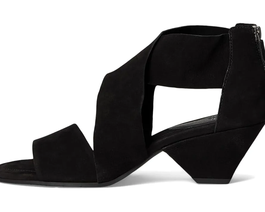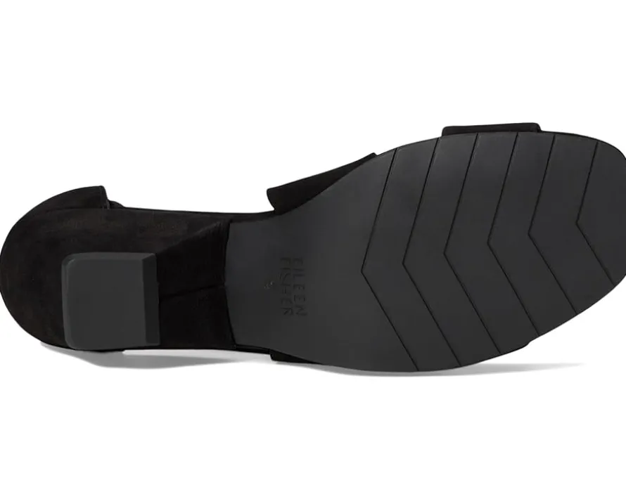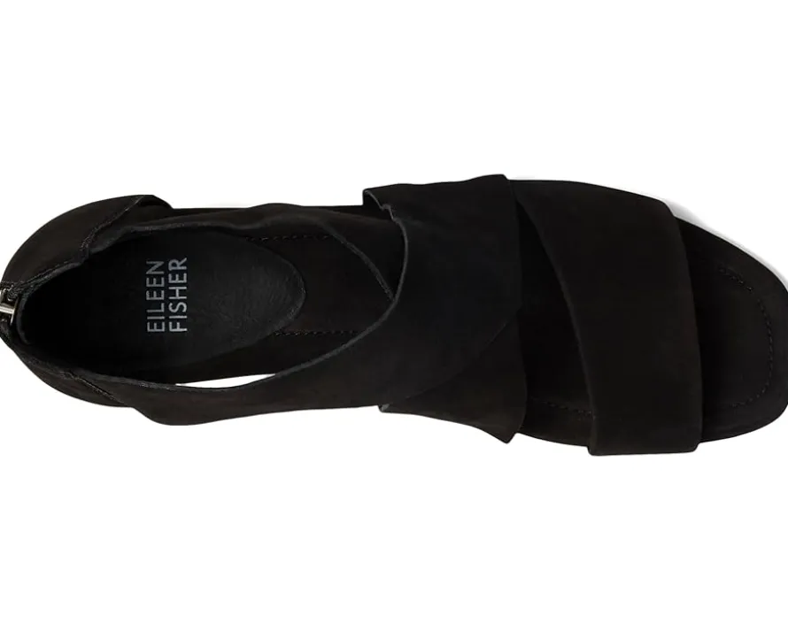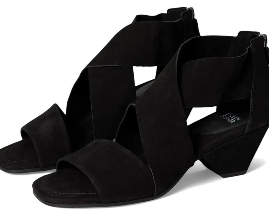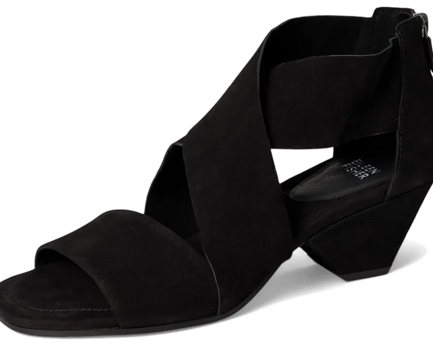- The Eileen Fisher® Junie is a perfect summer sandal with soft unlined leather straps and a back zipper for easy entry. It has an asymmetrical heel wrapped in leather, for poised elevation.