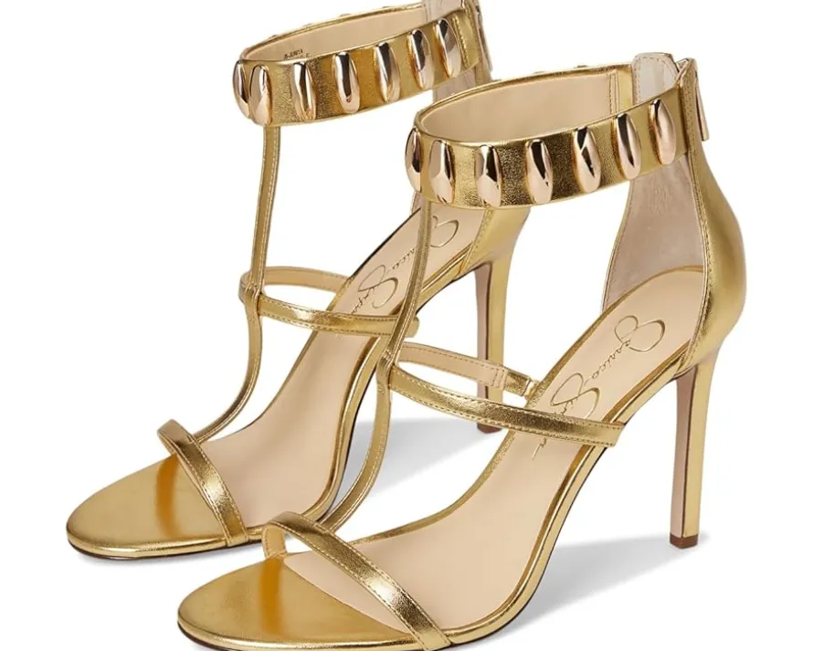 - The Juniya Studded Heeled Sandals from Jessica Simson™ is highlighted with goldtone ornaments on the ankle straps to give added attitude. Made with dual strap faux leather upper, these sandals are sure to turn heads. The polyester lining and insole ensure a comfortable fit, while the stiletto heels offer a flattering lift.