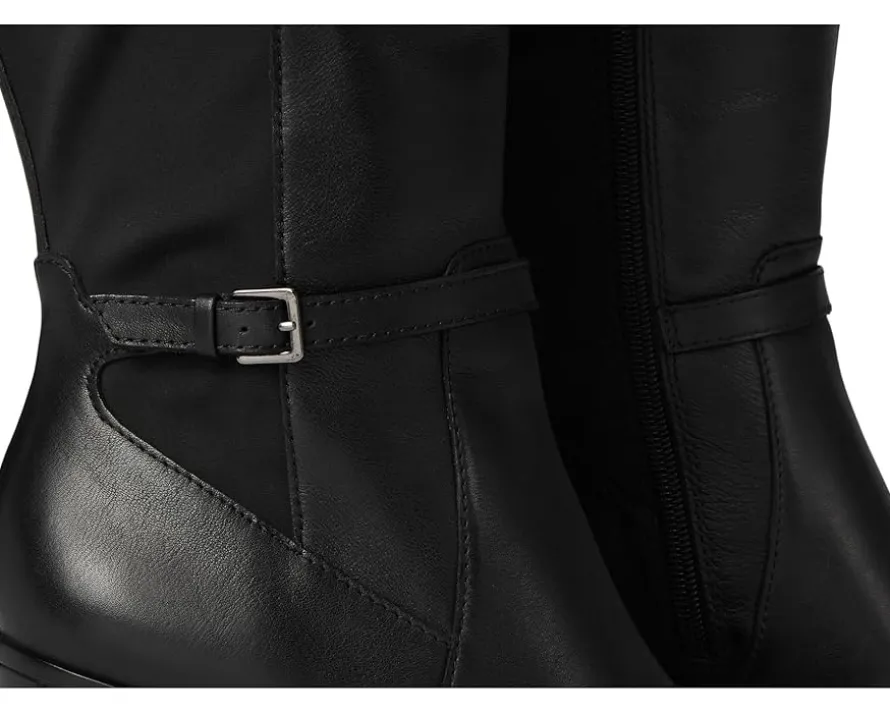 - Sleek heeled knee high boot with goring panel and decorative buckle.