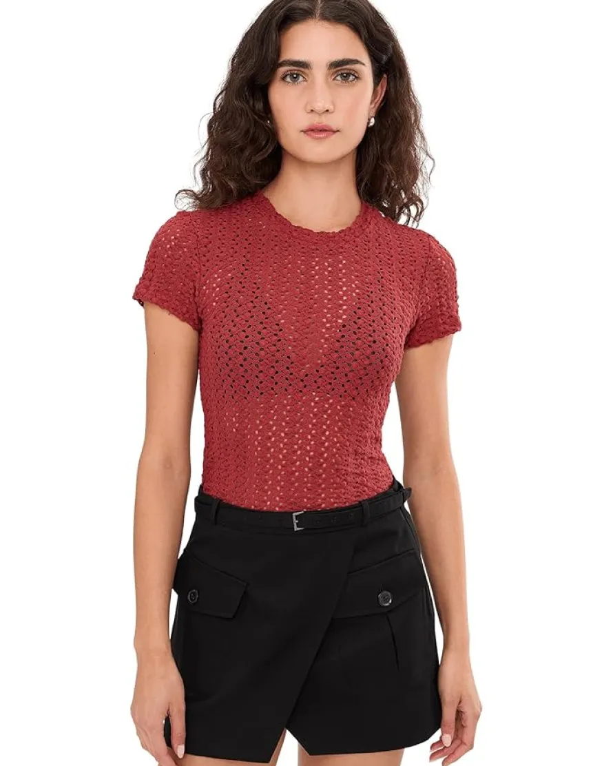 - The AllSaints™ Karma Stevie Tee is the perfect addition to your wardrobe. Made with a crochet-style fabrication, this tee features a crew neckline, short sleeves, and a narrow neckline binding. Its straight hemline adds a touch of sophistication to any outfit.