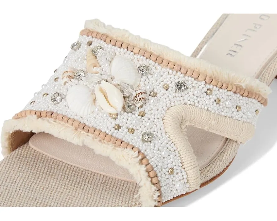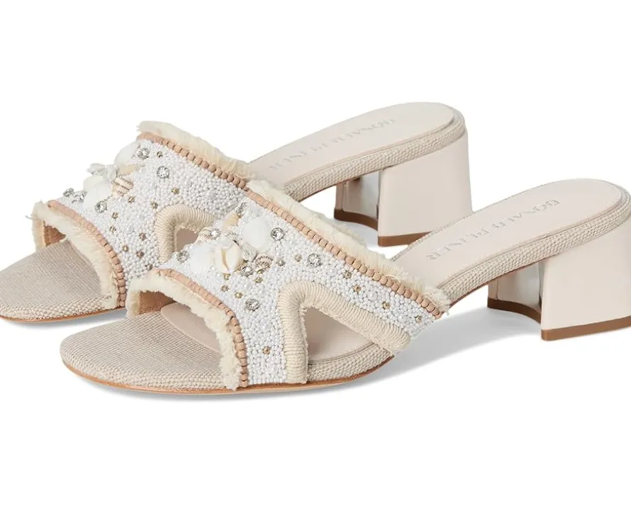 - The Donald Pliner® Kaylan sandals offer a breezy aesthetic with their intricate beaded detailing. These heeled sandals are made of a rubber upper and leather lining. Their slip-on design and memory foam insole ensures effortless comfort, making them a perfect go-to for warm days.