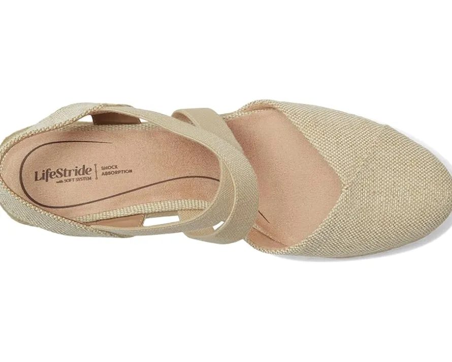 - From boardwalk to brunch: LifeStride® Kimball women’s espadrille wedges are the perfect blend of style and comfort. Featuring a chic canvas fabric upper with a fresh almond toe design, these slip-on shoes are your perfect blend of classic elegance and modern comfort. Designed with crisscrossing stretch gore straps for easy on/off and a jute-wrapped wedge heel, they offer effortless style for any occasion. Thanks to the Trusted Soft System® comfort technology, enjoy all-day cushion, support, and flexibility, along with superior shock absorption and pressure distribution. The partially recycled synthetic rubber lining and EVA insole enhance durability, while the traction PU outsole ensures stability.