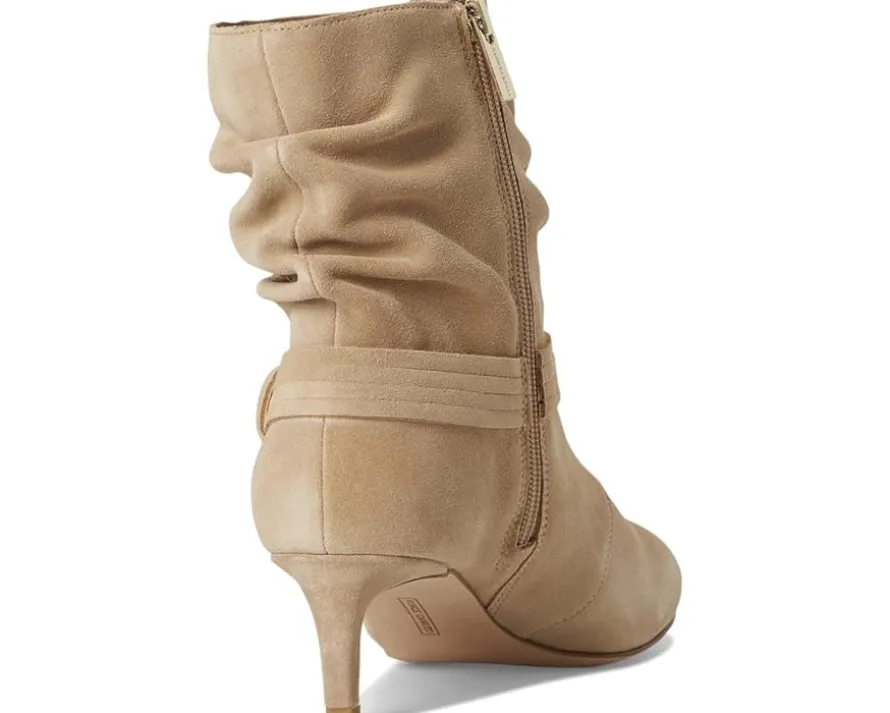 - The Vince Camuto® Kirpa Slouchy O-ring Bootsie is a perfect blend of effortless style and sophistication. The relaxed silhouette, combined with a pointed toe and a sleek kitten heel, creates an elegant yet laid-back vibe. A statement gold-tone circular buckle detail on the side adds a touch of vintage charm, while the wrapped suede straps enhance its bohemian appeal. Ideal for pairing with jeans, skirts, or dresses, this versatile boot is a timeless addition to any fashion-forward wardrobe.