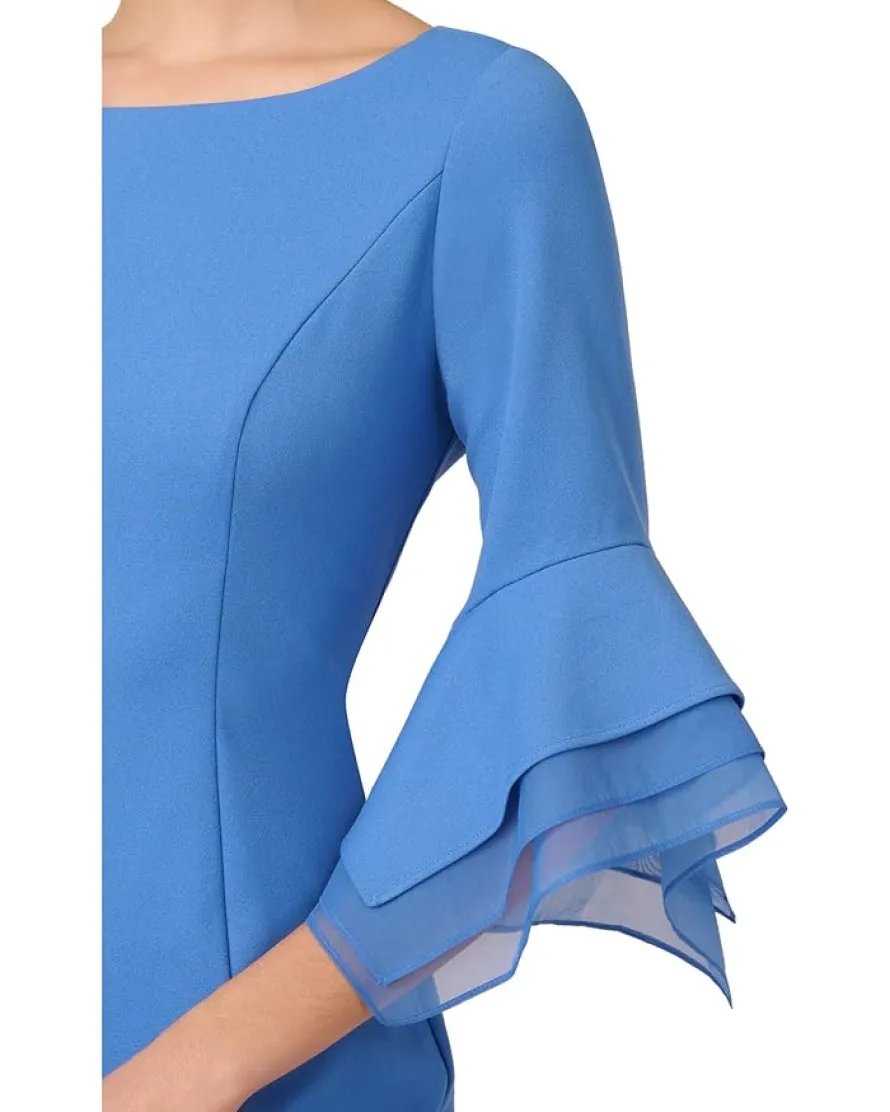 - Elegance redefined with the Adrianna Papell® Knit Crepe Tiered Sleeve Dress. Embrace timeless sophistication in this midi marvel with a boat neckline, fitted silhouette, and tiered bell sleeves. Crafted from knit crepe for comfort and stretch, featuring a zipper back closure, no waist seam, and a single pleat. Solid pattern, bow embellishment, quarter sleeves − redefine your style effortlessly.