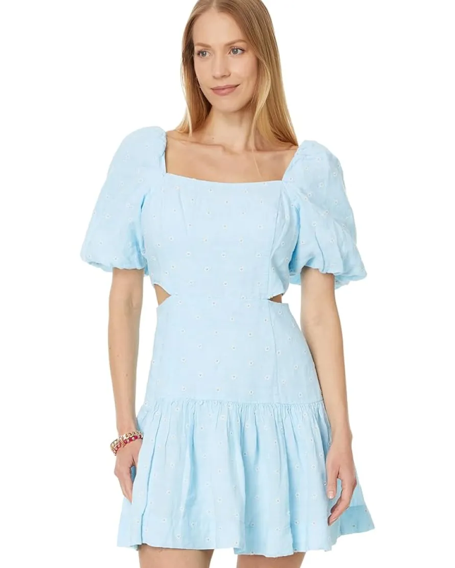 - Effortlessly chic and vibrant, the Lilly Pulitzer® Kylanne Elbow Sleeve Embr Linen Dress is a masterpiece of modern elegance. Featuring intricate embroidery embellishments, a flattering square neck, and a zippered back closure, this fit-and-flare dress with waist cut-outs and a tall ruffle at the hem exudes playful sophistication.