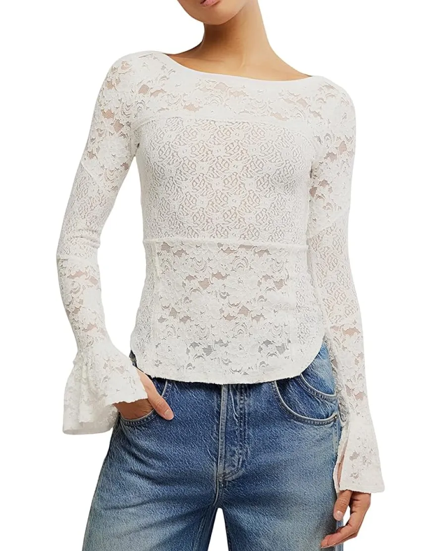 - Exude an elegant allure wherever you go wearing the Free People™ Lace Layering Long Sleeve Top. The pull-on style top features allover lace detailing, a boat neckline, long sleeves with flared cuffs, contrasting lace panels, and a straight hem.
