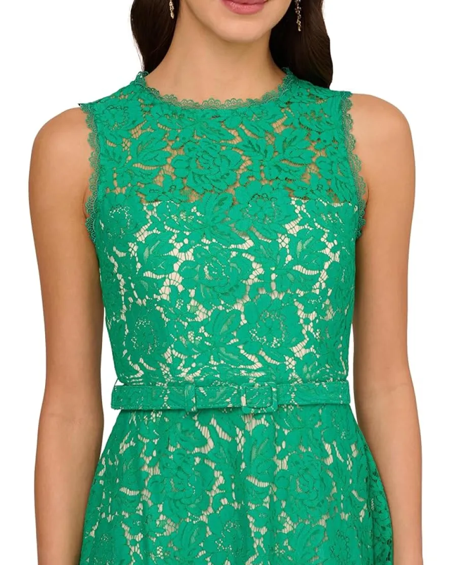 - Dressy by day, flirty by night, this lace dress is a charming look. This fit and flare dress features a crew neckline, sleeveless bodice with sheer lace at the yoke, and a belted waist. Partially-lined with contrasting fabric, this midi dress is crafted from lace that is sheer at the neck and hem. This party dress is closed with a zipper at the center back. Complete the look for a day at the office or a night out with nude heels and sparkling jewels.