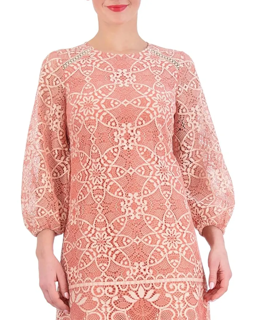 - Get ready to grab all the attention around you as you step into the party wearing the Vince Camuto® Lace Shift Dress. Fitted through the chest and arms and slightly loose through the waist and hips, this dress looks elegant with its jewel neckline, flowy elbow-length sleeves, and scalloped trims. The delicate and textured lace detailing throughout further beautifies this piece.