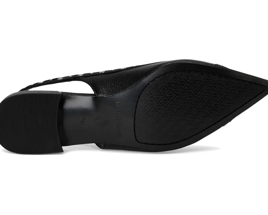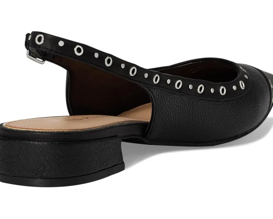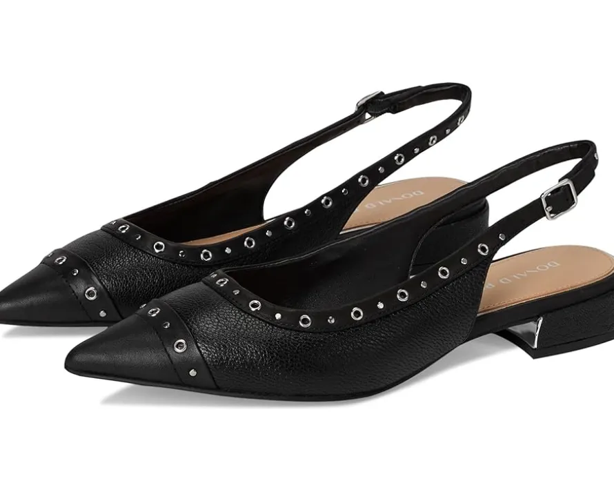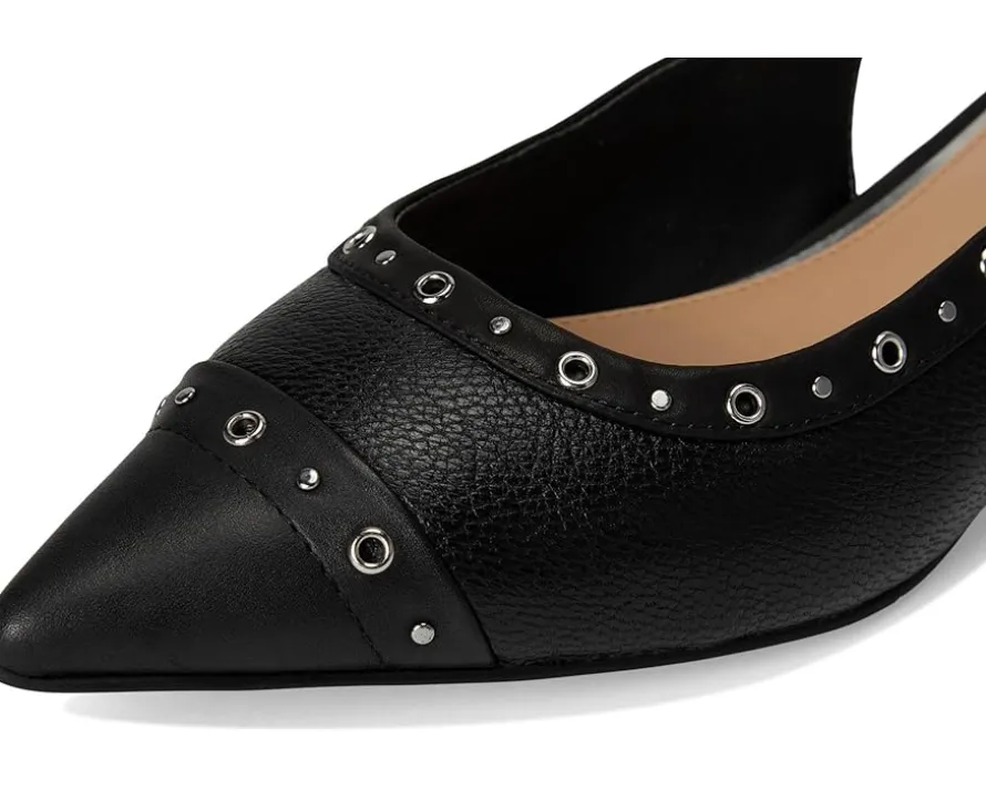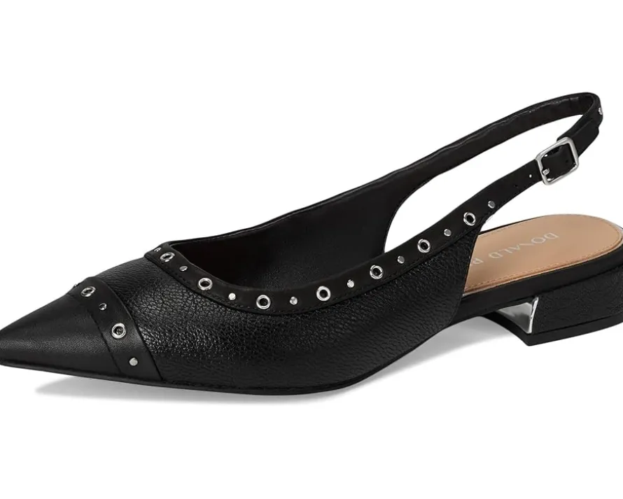 - The Donald Pliner® Lavinah studded slingback flat is the perfect fusion of modern edge and timeless sophistication. Crafted with a smooth leather upper, it features stud detailing that adds a rebellious yet refined touch. The pointed toe and low block heel create a polished silhouette, while the buckle adjustable slingback strap ensures a secure and comfortable fit.