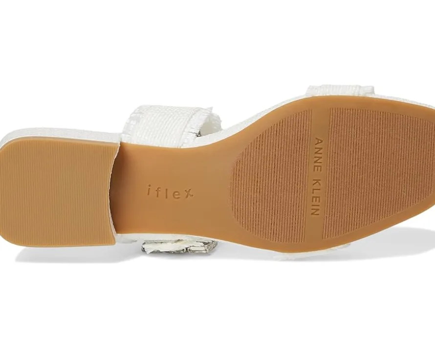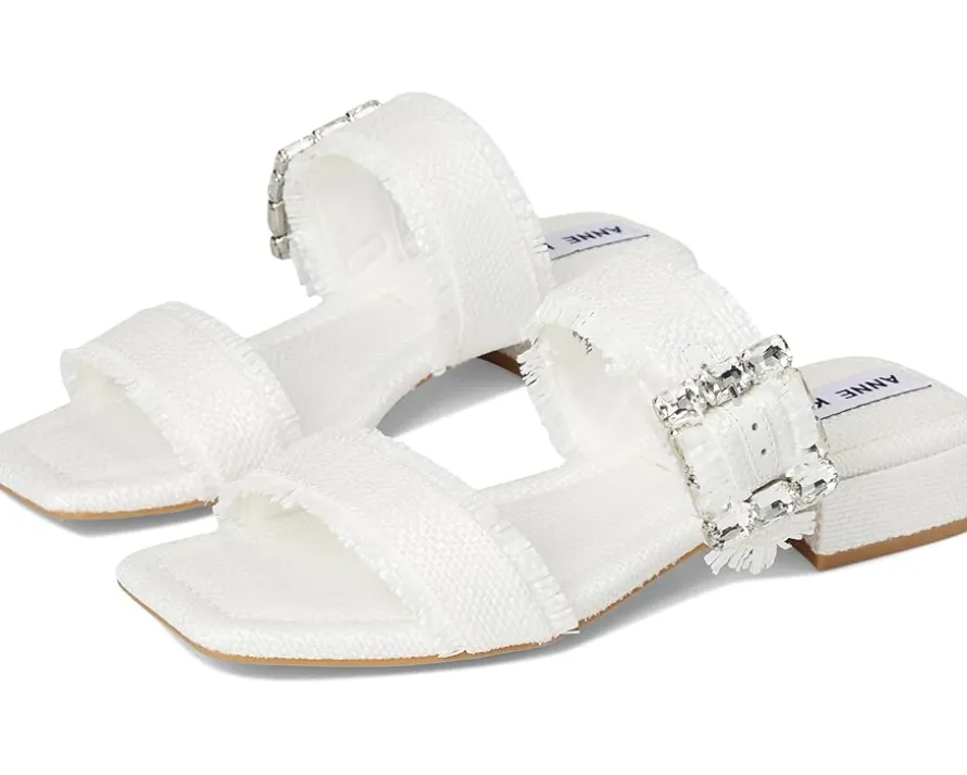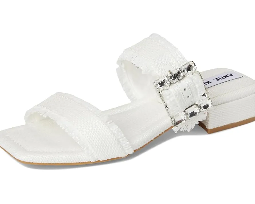 - The Anne Klein® Lillie slip-on sandal is perfect for elevating casual looks or adding a polished finish to dressier outfits. This two-banded open-toe sandal features a chic square toe shape and a dazzling crystal buckle detail that adds just the right amount of sparkle. The frayed edges lend a trendy, fashion-forward touch, while the low block heel ensures comfort without compromising on style.
