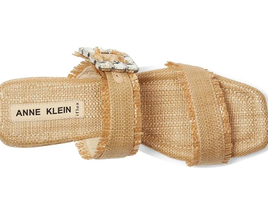 - The Anne Klein® Lillie slip-on sandal is perfect for elevating casual looks or adding a polished finish to dressier outfits. This two-banded open-toe sandal features a chic square toe shape and a dazzling crystal buckle detail that adds just the right amount of sparkle. The frayed edges lend a trendy, fashion-forward touch, while the low block heel ensures comfort without compromising on style.