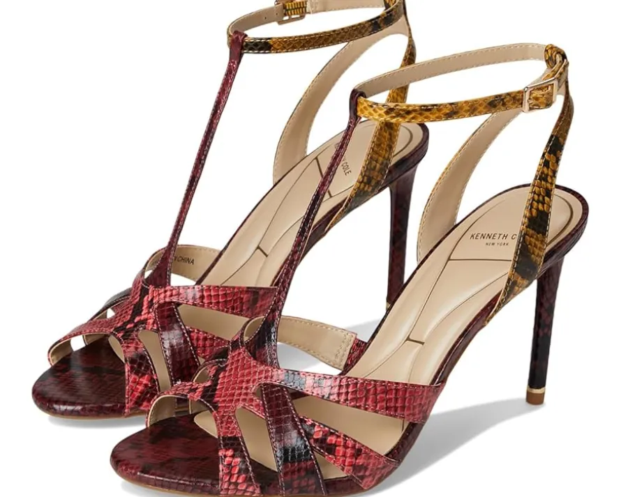 - The Kenneth Cole New York® Liona is a comfortable T-strap dress sandal with adjustable buckle closure. With a sleek stiletto heel, this almond toe style boasts faux leather upper, lining and insole construction.