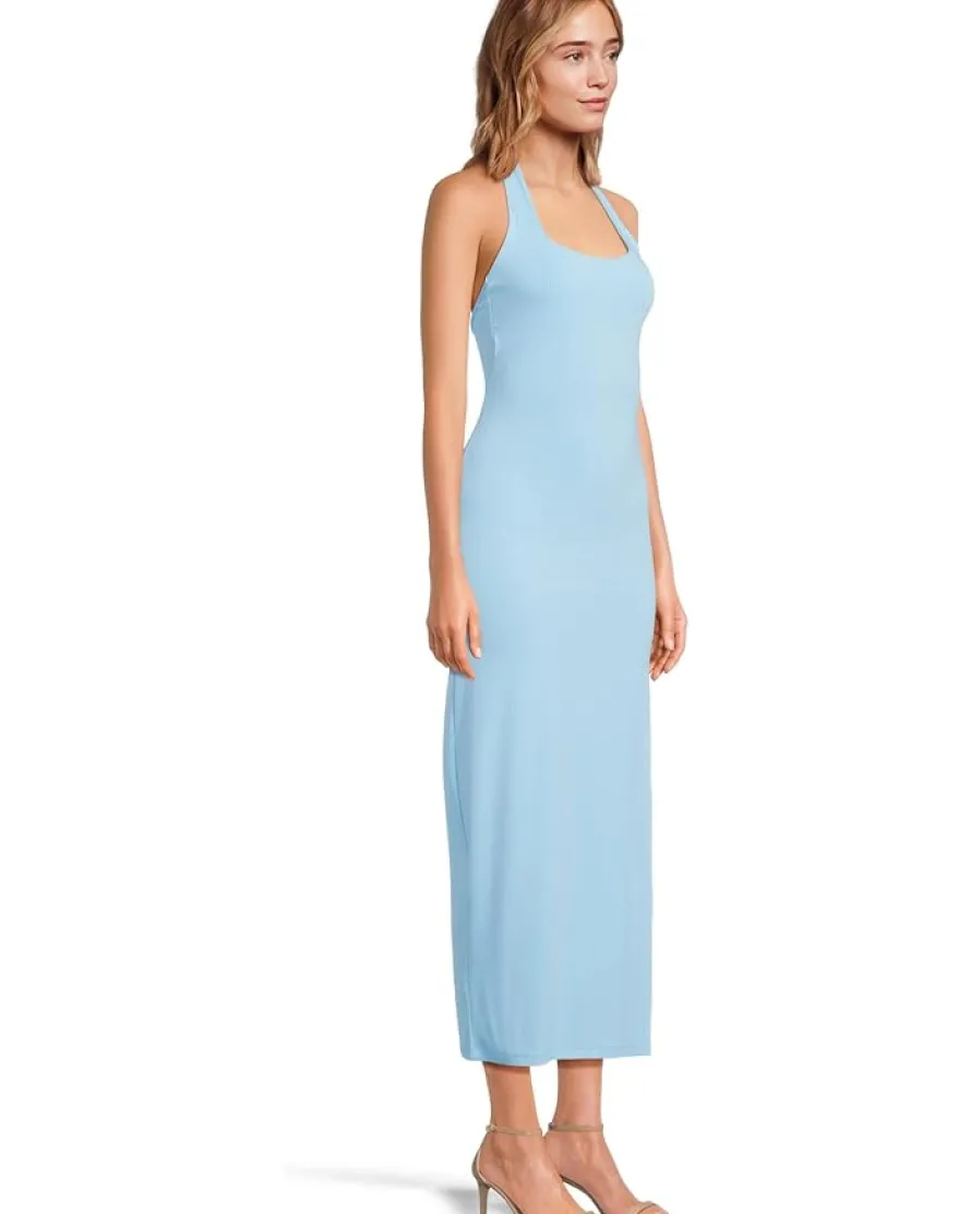 - Look hot and sexy wearing the L*Space® London Dress. This dress features halter neckline, sleeveless style, shelf bra, ribbed frock with a rounded square neckline, and open back. It comes with allover stripe detailing, and side slit detailing.