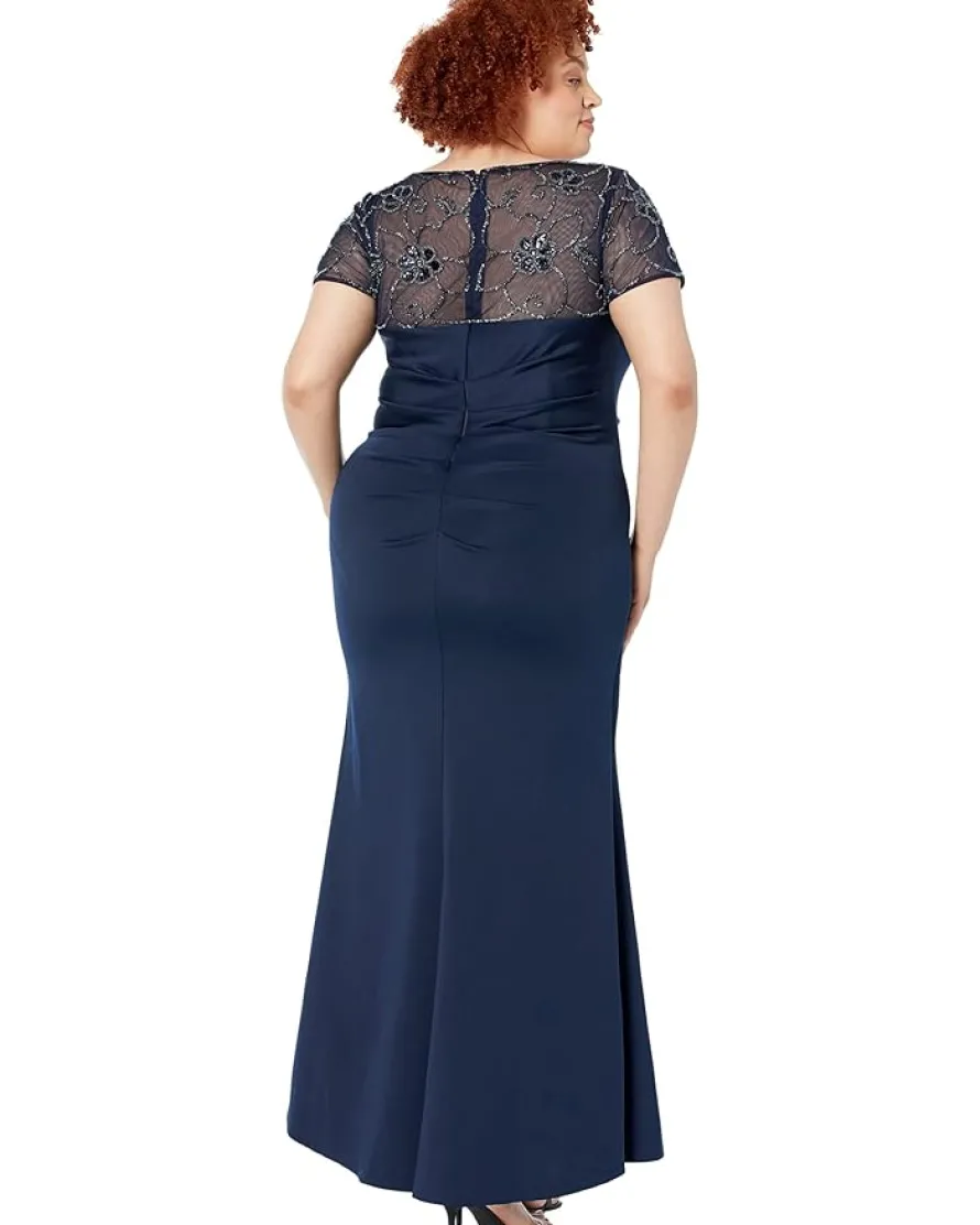 - Feel gorgeous wearing the glamorous XSCAPE™ Long Scuba Dress with Ruching, Ruffles and Beading crafted from a fabric with a unique sheen.