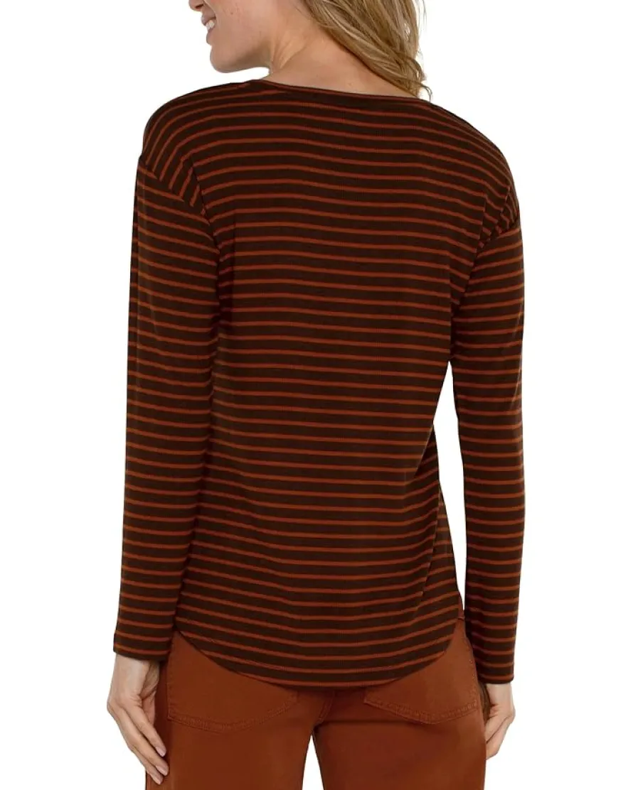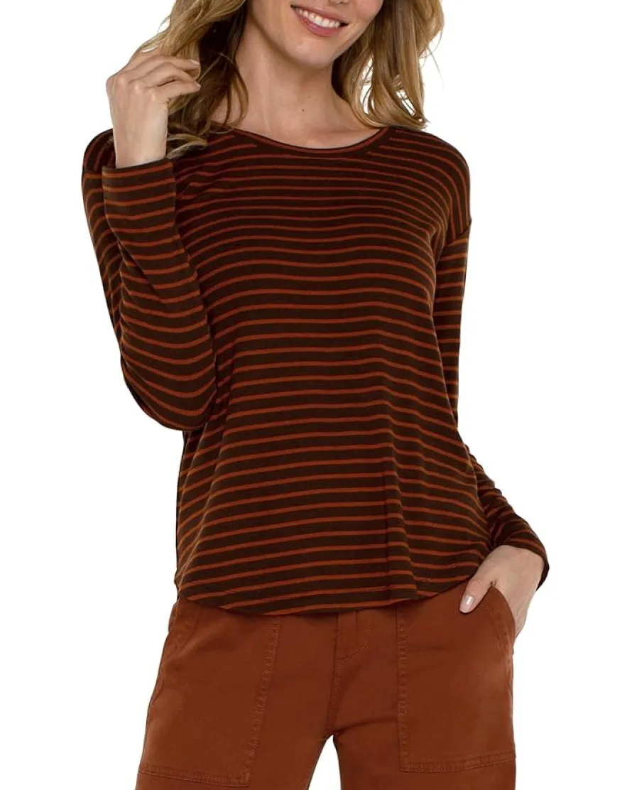 - Bring a contemporary hint of timeless allure wearing the luxuriously soft Liverpool™ Los Angeles Long Sleeve Drop Shoulder Scoop Neck Rib Knit Top. It features a scoop neckline and long sleeves with drop shoulder seams. The curved hem is dramatically shaped to complement your easy-breezy style.