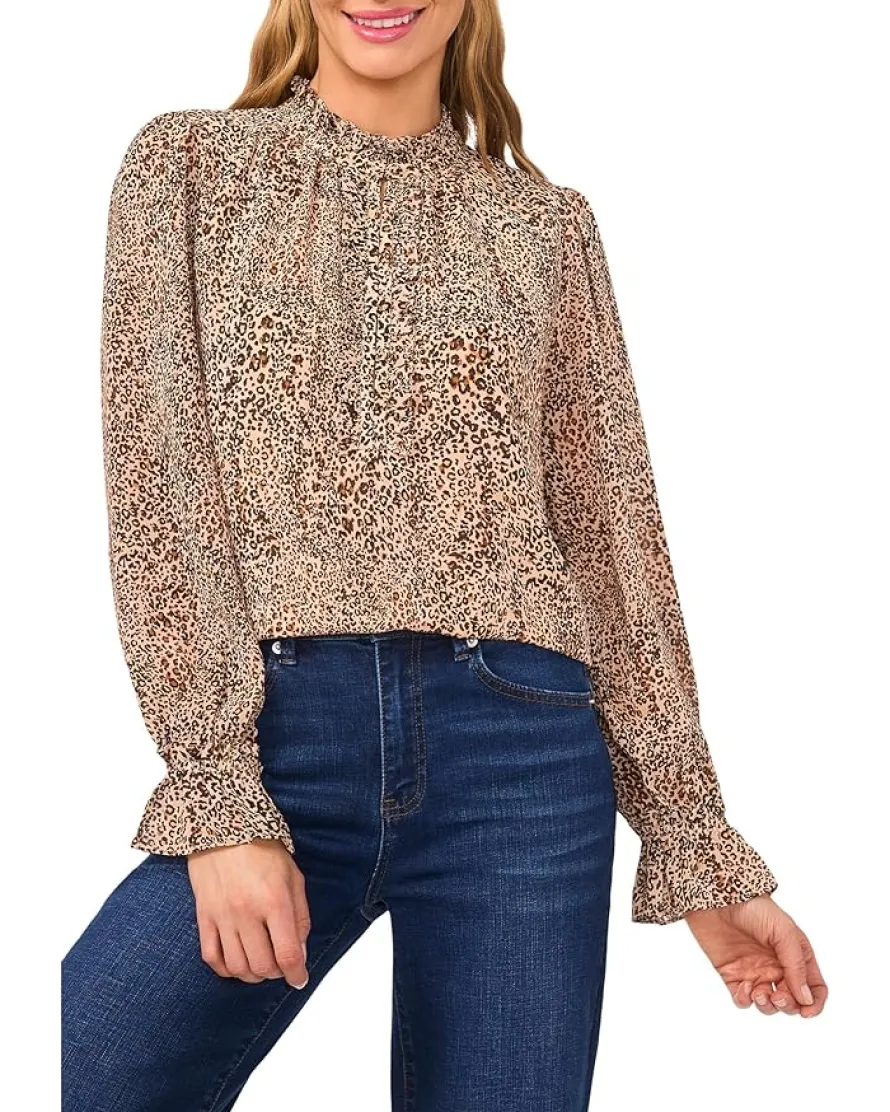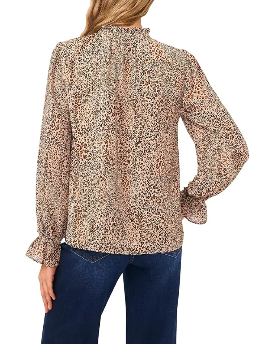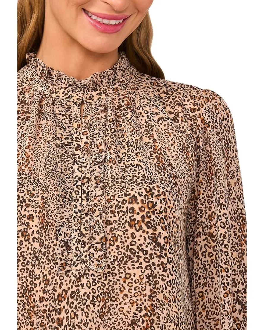 - Turn heads in the CeCe™ Long Sleeve Leopard Ruffled Top, a bold blend of untamed elegance and romantic charm. This classic-fit blouse features a fierce leopard print that exudes confidence, while delicate ruffles at the high neck and sleeves add a soft, feminine flair. Subtle shirring brings flattering texture and shape, creating a silhouette that’s effortlessly chic. Long sleeves provide year-round versatility, and the pull-on style makes it as easy as it is eye-catching. Finished with vintage-inspired buttons at the neckline, this top is perfect for brunch dates, office hours, or a night out.