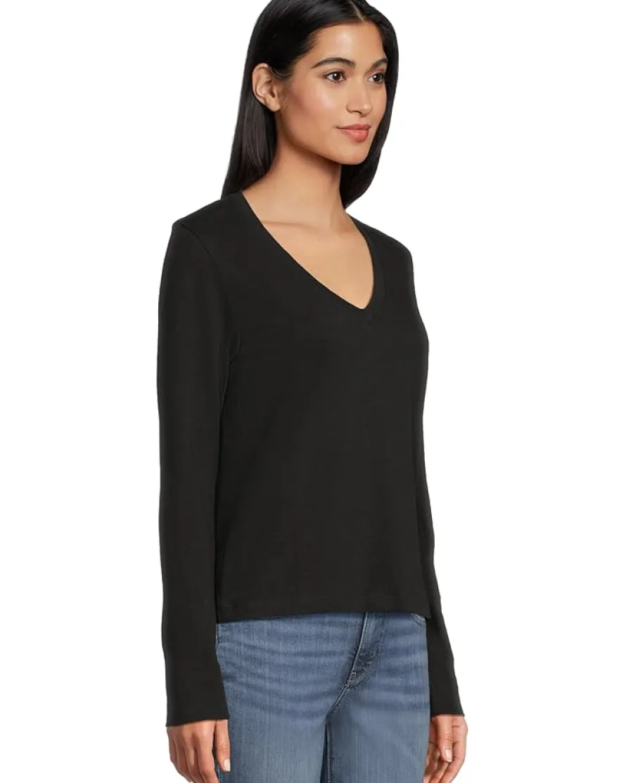 - The art of the easy essential: The Lilla P™ Long Sleeve Self Trim V-Neck. Crafted in new heavier-weight Vintage Slub fabric, this tee delivers a beautifully pronounced texture that feels soft, breathable, and endlessly comfortable. The bias-cut construction creates a close-to-the-body silhouette that flatters without clinging, while the regular fit, long sleeves, and easy pull-on design ensure all-day wearability. The modern cropped length adds a fresh twist to a timeless V-neck, making it the perfect piece to pair with high-rise denim, skirts, or layered looks. Finished with simple overlocked hems for an effortlessly polished touch, this updated staple brings a blend of refinement and relaxed charm.