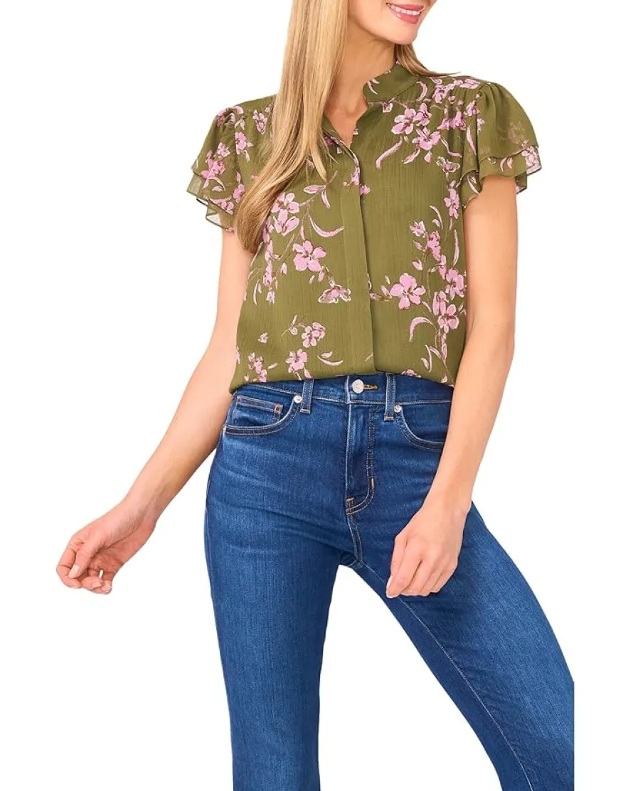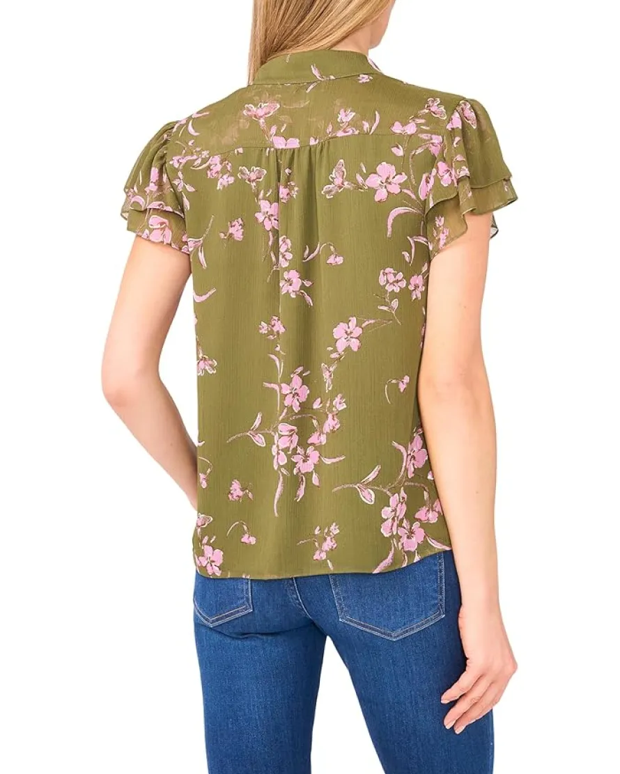 - Flowy and flirty, the CeCe™ Long Sleeve Tie V-neck Ruffled Top brings instant polish to your everyday style. Designed in a classic fit, this blouse features a romantic tie-front V-neckline and delicate ruffled short sleeves that add a soft, playful touch. The Mandarin collar lends a hint of sophistication, while elasticized sleeve openings ensure a comfortable fit that moves with you. A hidden snap-button front closure keeps things neat and stylish, and the body-lined design offers effortless coverage.